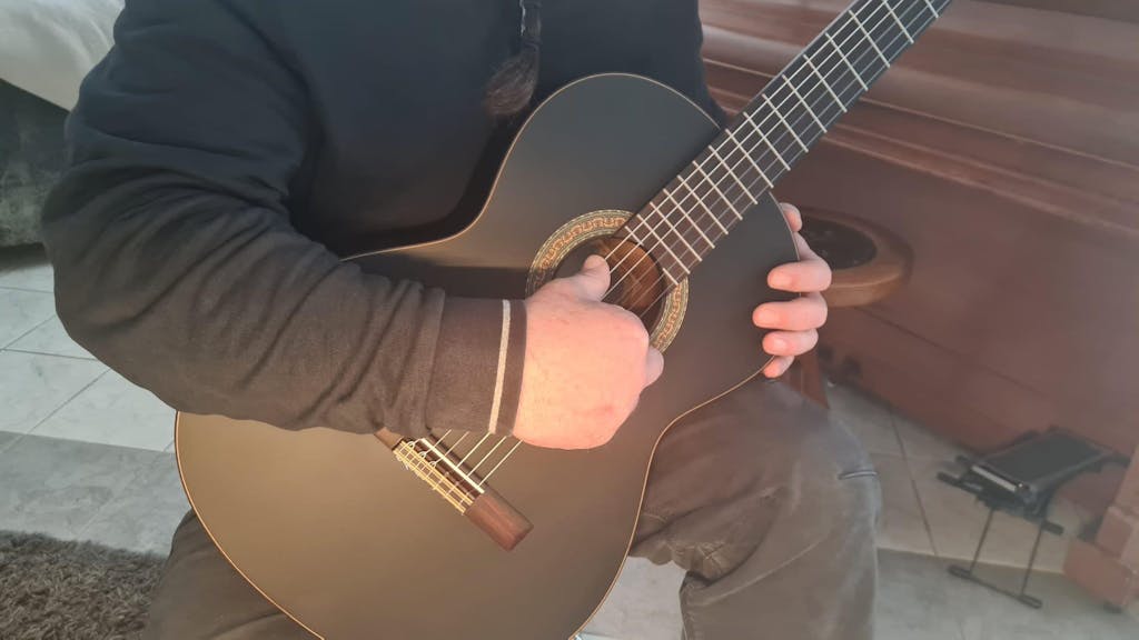An instrument for beginners, it's built with high-quality materials, is lightweight, and features excellent craftsmanship. A good action and nickel silver frets contribute to the Model 1C's comfort, making it a great entry-level guitar.