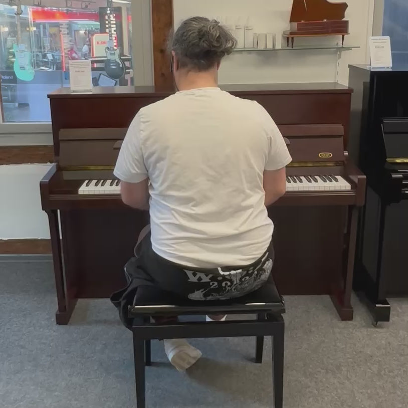 Die OberflĂ€che in Mahagoni poliert verleiht dem Klavier eine warme, luxuriöse Ausstrahlung. Dank seiner kompakten Bauweise passt es perfekt in jedes Wohnzimmer, ohne dabei an klanglicher PrĂ€senz einzubĂŒĂen.